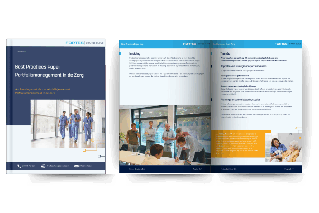 De complexe omgeving waarin zorginstellingen, zorgverleners en toeleveranciers opereren vraagt om een professionele projectportfolio-aanpak. Dat geeft grip op transitieprogramma’s en innovatieprojecten. Fortes Change Cloud biedt dit alles al ruim 25 jaar. Ziekenhuizen, zorginstellingen, farmaceuten, gemeenten en zorgverzekeraars gebruiken de Fortes Change Cloud software om hun projecten en programma’s in te managen.